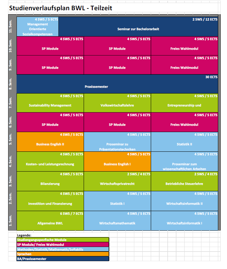Das Teilzeitstudium ist für alle diejenigen eine Alternative, die neben dem Beruf oder Betreuungsaufgaben, wie z.B. der Betreuung von Kindern oder die Pflege von Familienangehörigen, studieren möchten. Das Studium wird auf regulär 11 Semester unterteilt, wobei in jedem Semester ca. 15 ECTS erlangt werden und durchschnittlich drei Module erbracht werden müssen. Diese Studienform ermöglicht es Studentinnen und Studenten einen Abschluss in Regelstudienzeit zu erreichen, wenn ein Vollzeitstudium nicht abgeschlossen werden kann.